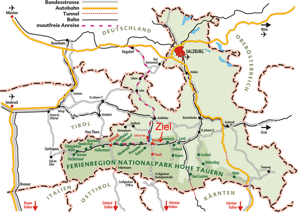 Wien - A1 (vignettenpflichtig) - Salzburg - Ausfahrt Bischofshofen - Taxenbach - Richtung Bruck an der Großglocknerstraße - vor Bruck weiße Kirche rechts am Berg weithin sichtbar